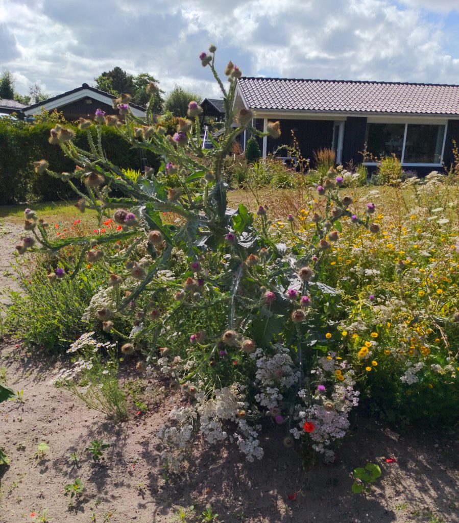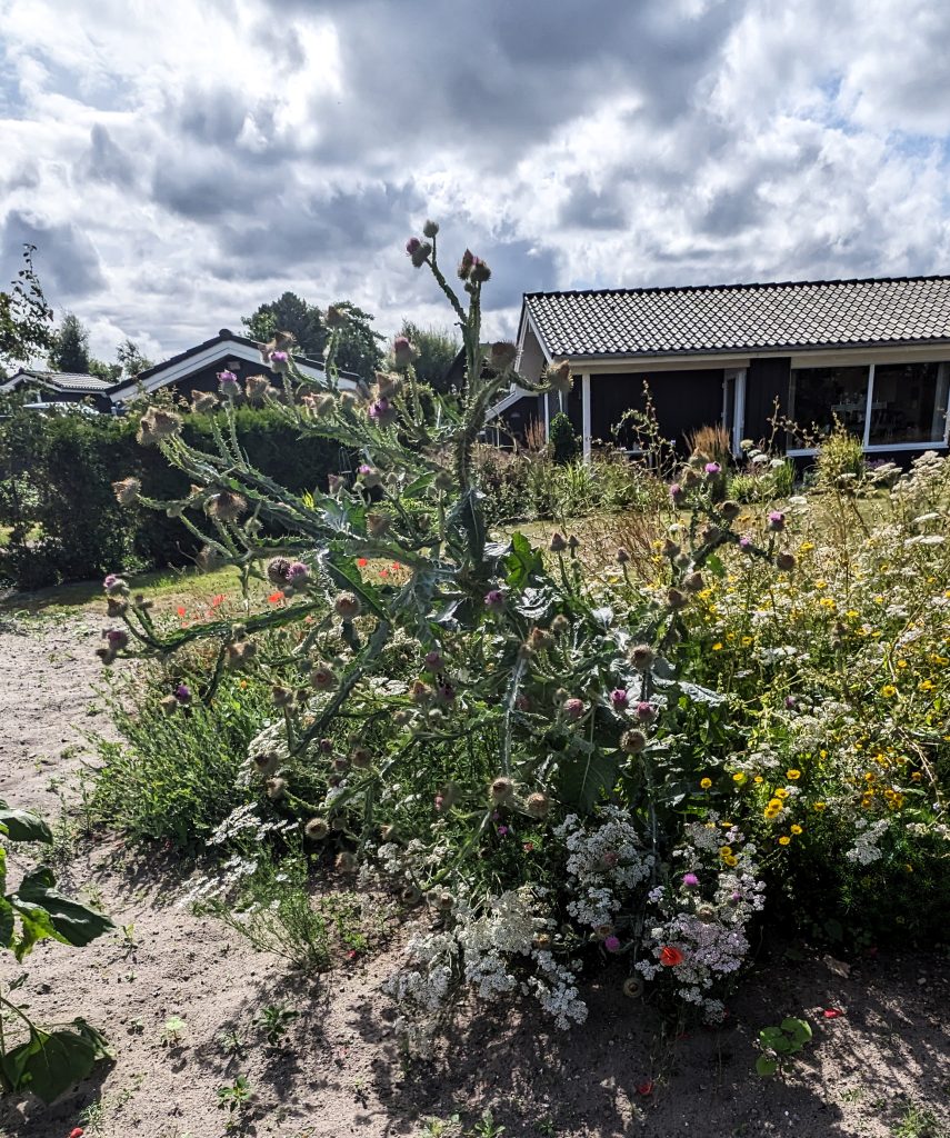 Denne tidsel er rent kulinarisk et helvede – bladene er tornede og stilken har tornede vinger. Men imponerende er den – 2,5 meter høj var det eksemplar jeg fik øje på. Det var i udkanten af en have, men haveejeren forsikrede mig om at hun havde i hvert fald ikke sået den.